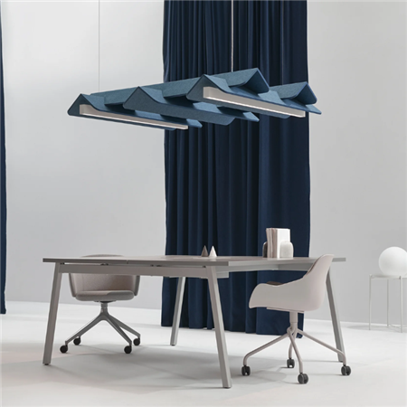 <p>Piramid Ceiling is a multifunctional suspended ceiling system that provides top-quality direct lighting and effective sound damping, which is sought-after in the office sector. It is distinguished by a pyramidal arrangement of acoustic baffles arranged alternately lengthwise and crosswise design. The unlit acoustic baffles complement the linear luminaires and add a sound-dampening cover to large ceiling expanses. These stunning sound management solutions use two 4-foot Line 43 linear luminaires. </p>