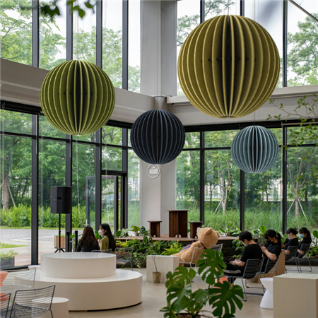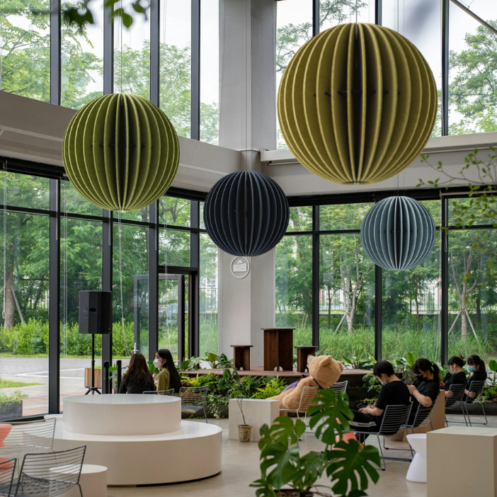 A spherical acoustic pendant luminaire defined by its distinctive globe-like form. Crafted from ecoPET acoustic material, it combines functional lighting with sound-absorbing properties to enhance interior comfort. Its soft, diffused illumination reduces glare while adding a strong visual identity, making it suitable for a variety of interior spaces.