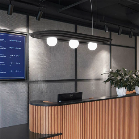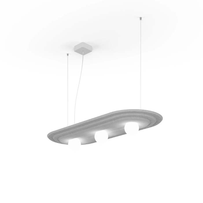 A decorative acoustic pendant luminaire that combines ambient lighting with refined design. Featuring three spherical light sources set within a layered ecoPET panel, it creates a soft, atmospheric glow while contributing to improved acoustic comfort. Its horizontal form and clean lines make it suitable for expressive interior spaces.