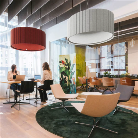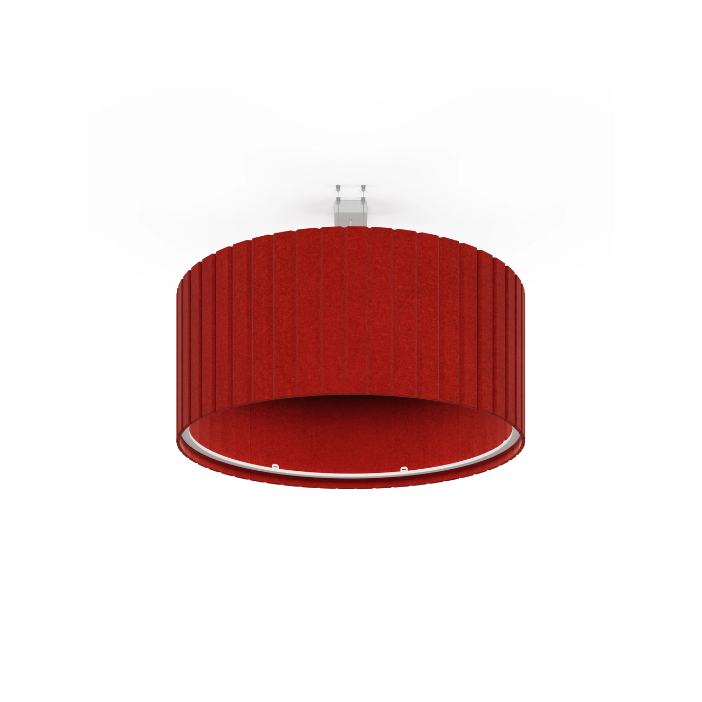 A cylindrical acoustic pendant luminaire defined by its structured vertical ribs and clean, drum-like form. The layered ecoPET surface creates a strong visual texture while helping to absorb ambient noise, making it both a functional and decorative element. Its wide, enclosed shape allows for even light distribution, producing a soft and comfortable glow within the space. Roller PET works well across a variety of interior settings, from open workspaces to hospitality environments.