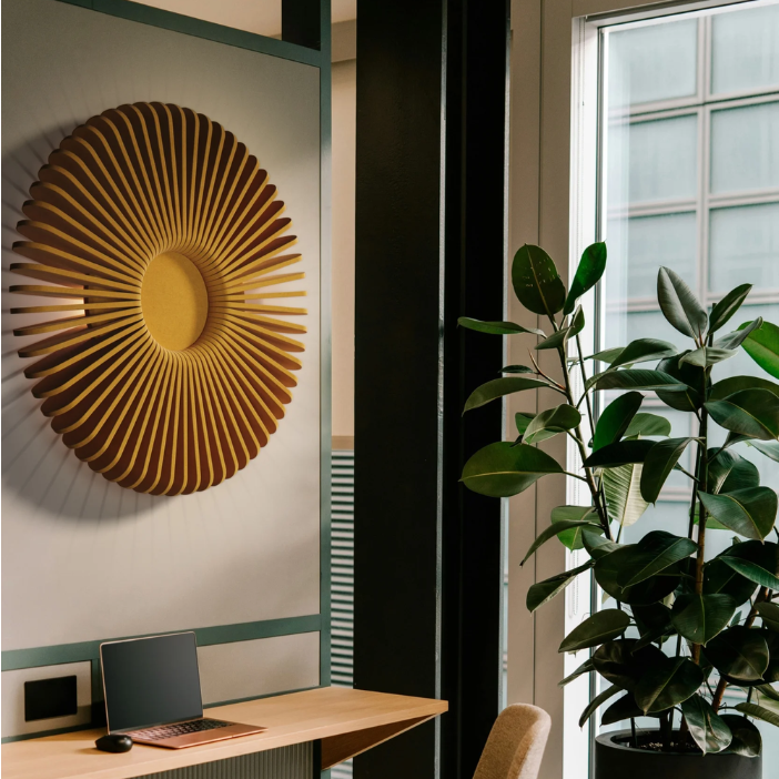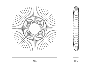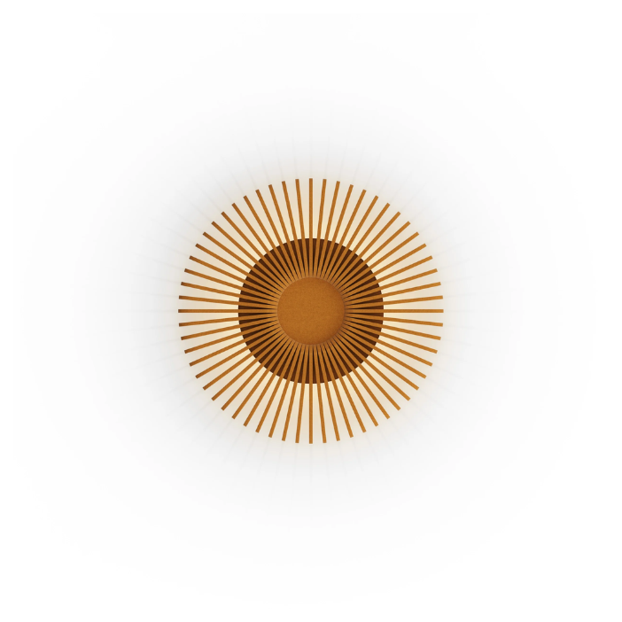 A bold wall luminaire inspired by the form of the sun, featuring a radial ecoPET structure that spreads outward like sun rays. It emits a soft, indirect glow that reflects off the wall, creating a warm halo effect while also enhancing acoustic comfort. The layered circular design makes it both a functional light source and a strong decorative feature for interior spaces.