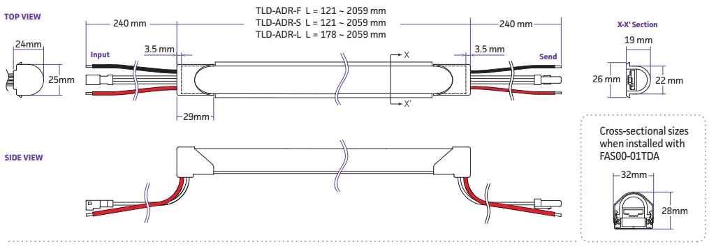 Dot free and seamless RGB colour changing with pixel control. IP67 flexible vertical bend LED strip covered by transparent silicone rubber case. Maximum unit connectable 6.2m, customizable length from 121mm to 2059mm.