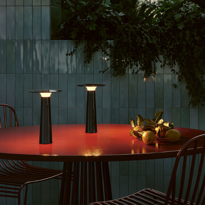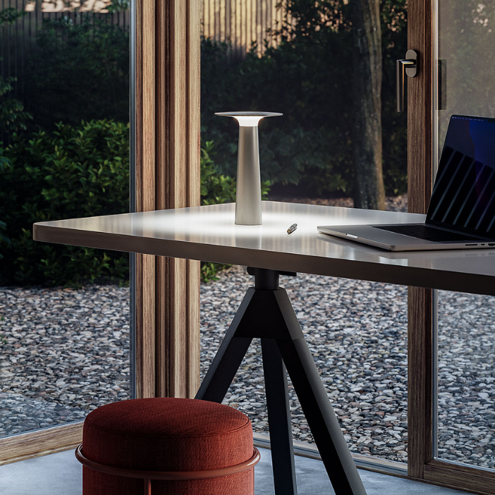 A sleek portable luminaire designed for versatile indoor and outdoor use. The lix features a clean, minimal form with a dim-to-amber function that transitions from warm white to a soft candle-like glow. It recharges easily on its charging base, offering convenient and flexible lighting wherever needed. Available in various finishes.