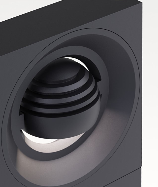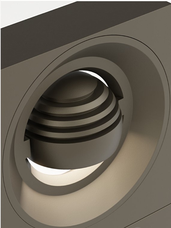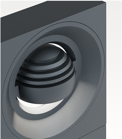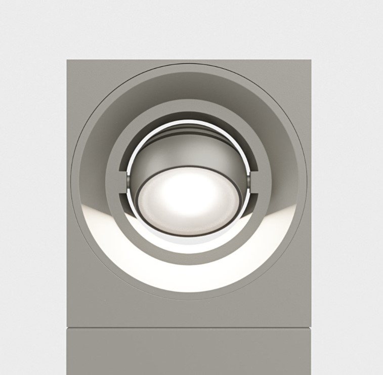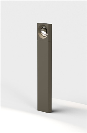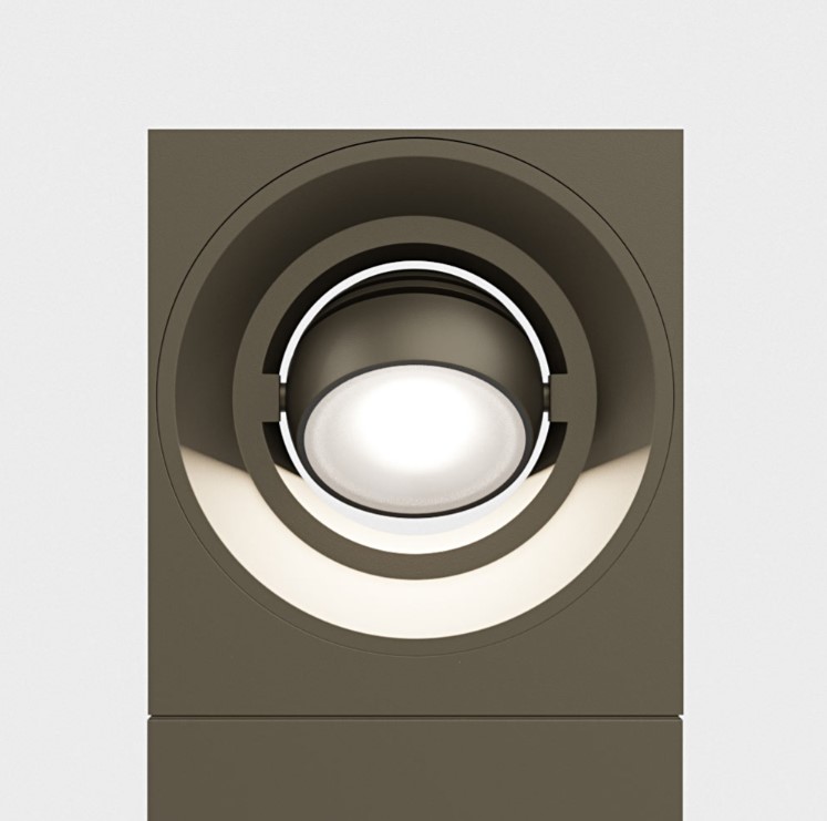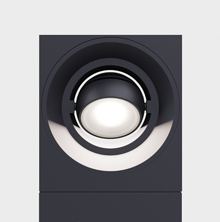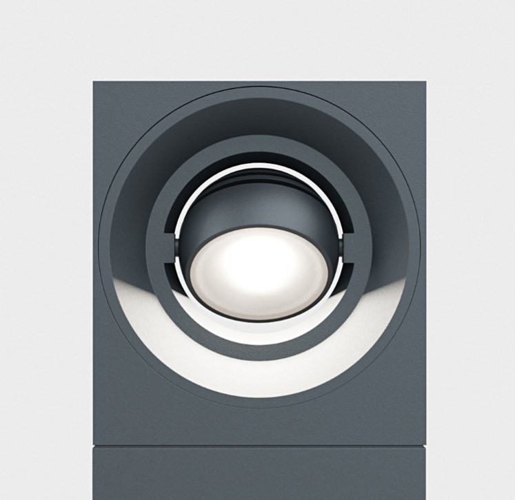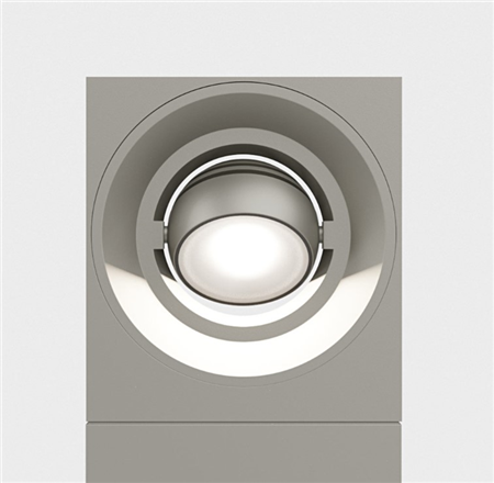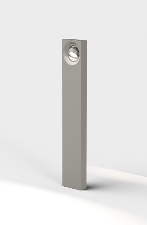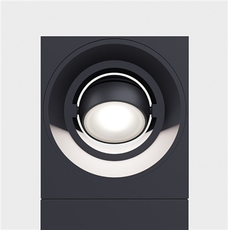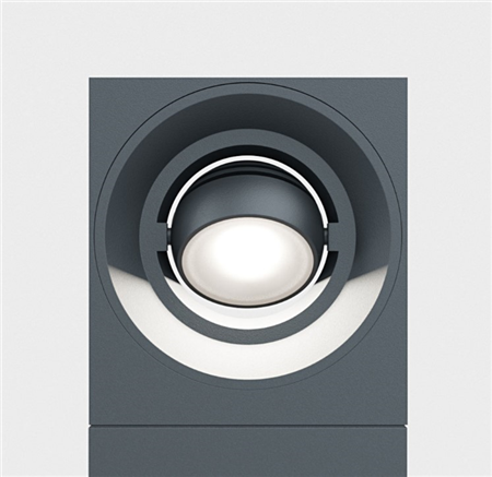 A bollard that is playing with geometry. IP65 floor mounted rectangular bollard with directional spherical luminaire head. Body in die cast aluminium with safety satined glass diffuser, 240° rotatable . Available in various colour selections.