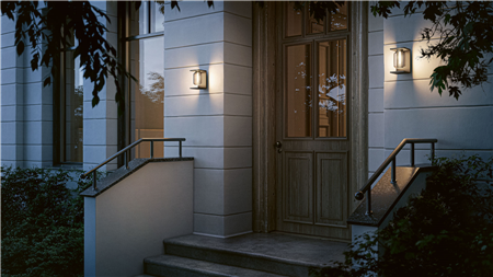 Traditional lanterns combines with straight-lines design. IP65 wall mounted luminaire, body in blown glass and die cast aluminium frame, 360° light output. Available in two finishes.